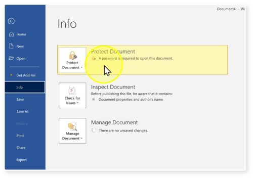 6. In the Info section, it will show ‘Protect Document: a password is required to open this file’